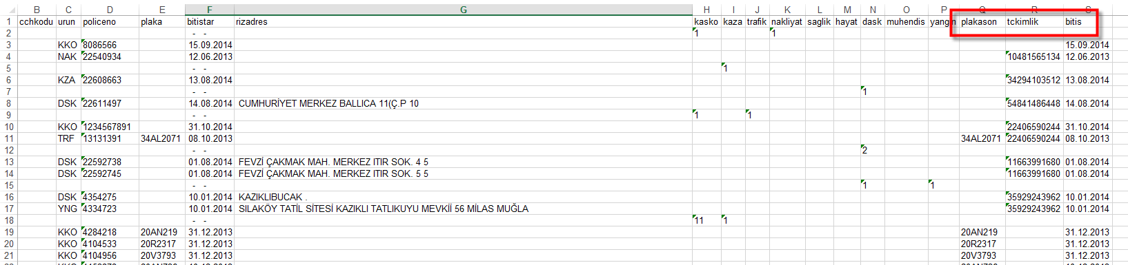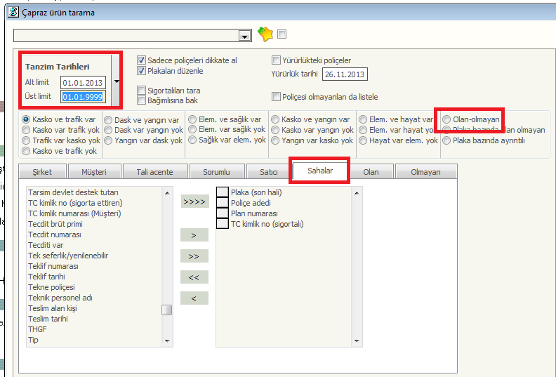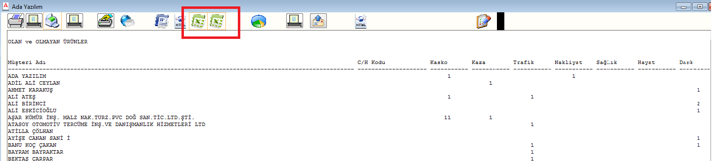 Olan/Olmayan seçimi ile bir müşteriye ait hangi branş ve üründen kaç adet poliçesinin olup olmadığını raporlayabilirsiniz.Ekranda Sahalar kısmından polğiçelere ait hangi bilgilerin gelmesini istiyorsanız,istediğiniz seçimleri ayarlayabilirsiniz.Çıkan Rapor ekranını excel resminden excele atarak düzenlemeler yapabilirsiniz,sahalar kısmından yapmış olduğunuz seçimler excel attığınızda karşınıza çıkacaktır.(Bkz:Şekil 4)