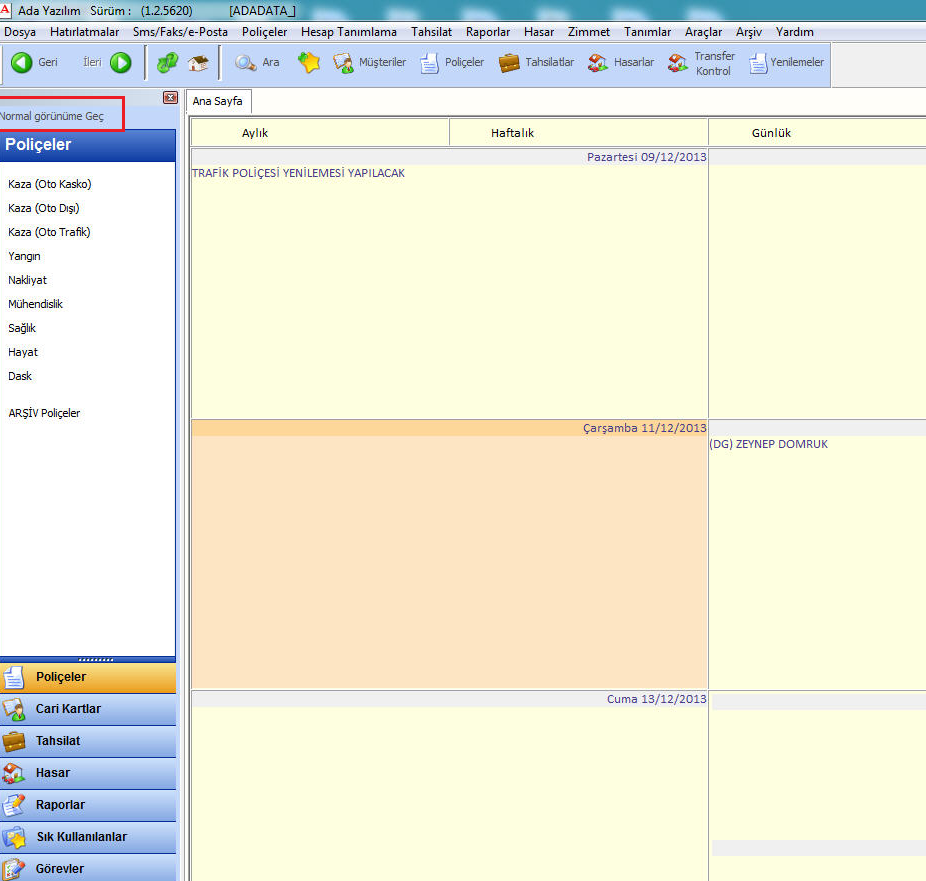 Ada yazılım 'a ilk girdiğiniz normal görünümünde yaptığınız tüm müşteri, poliçe , tahsilat ve raporlama işlemlerini Düzlem ekranından da yapabilirsiniz. Bu ekrandan çıkış yapmak için Normal Görünüme Geç seçeneğine tıklanır.