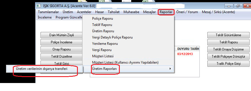 Ekrandan Raporlar/Üretim Raporları/Üretim verilerin dışarıya transferi adımları uygulanır.