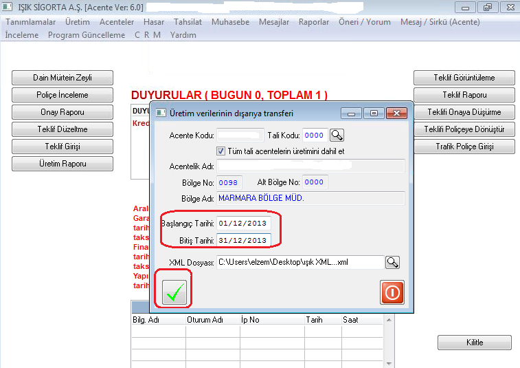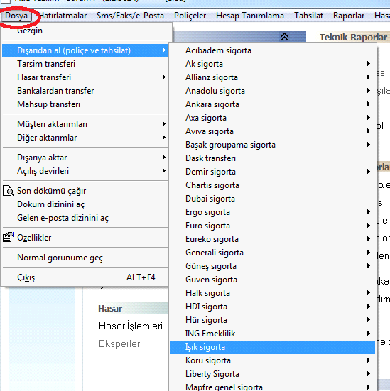 Oluşan xml dosyasını Ada programında Dosya / Dışarıdan Al / Işık Sigorta altından dosyayı kaydettiğiniz yerden seçiniz.