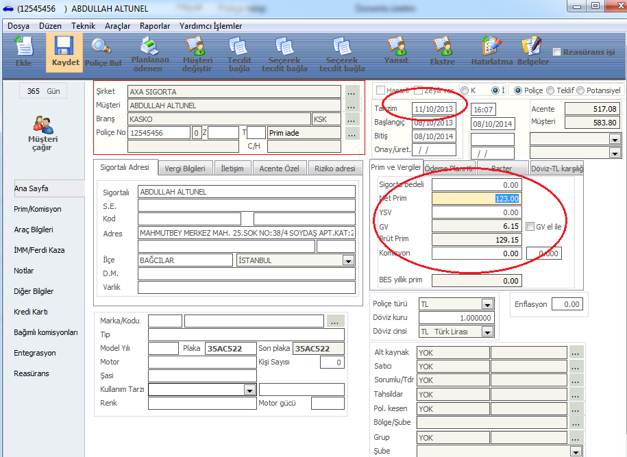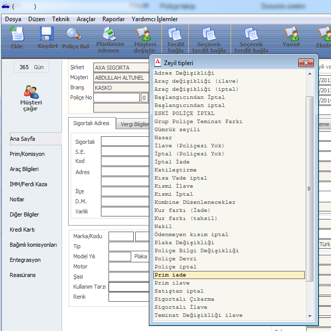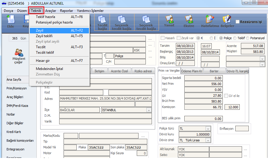 Manuel girdiginiz poliçe üzerine eger bir zeyil duzenlenirse, yine ilgili olan branstan girip poliçenizi aratın. Buldugunuz poliçeyi ekrana cagırın ve Teknik / Zeyil menusunden işleme başlayabilirsiniz.