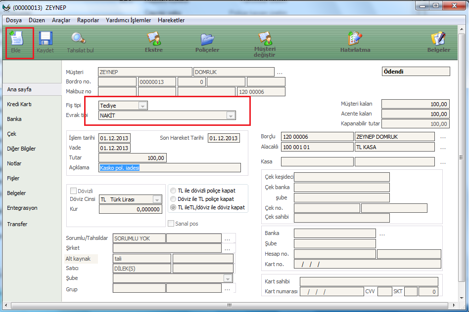 Tahsilat ve poliçe kapama ekranında Ekle (ctrl+n) tuşuna basılır.