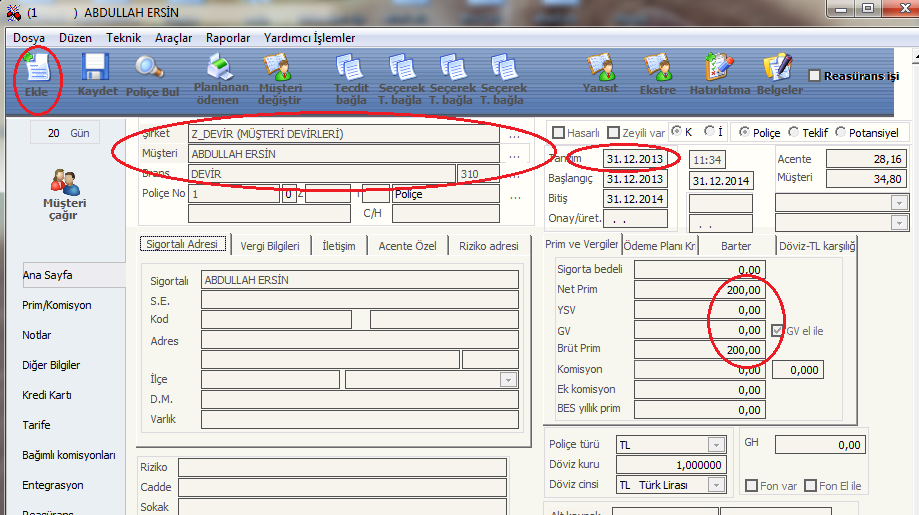 Devir poliçesi girmek için oncelikle Kaza Oto Dışı linkine tıklanır ve Ekle diyerek işleme başlanır. Daha sonra şirket olarak Z_Devir secilir. Devir tutarı kime ait ise o musteri secilir. brans olarak devir yazan secilir. Tarih kısmına hangi yıldan devreden ise, o yılın sonu girilir. Tutar yazılıp Kaydet butonu vasıtasıyla kaydedilir.
