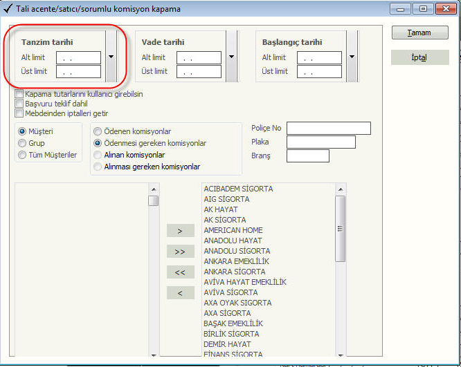 Sonra Araçlar/ Müşteri komisyon kapama( evrak üzerinde f8 ) seçeneği ile gelen ekrandan Tanzim tarihi gibi bir kriter de seçilebilir. (Bkz. Şekil 12) Tamam'a butonuna basılır.