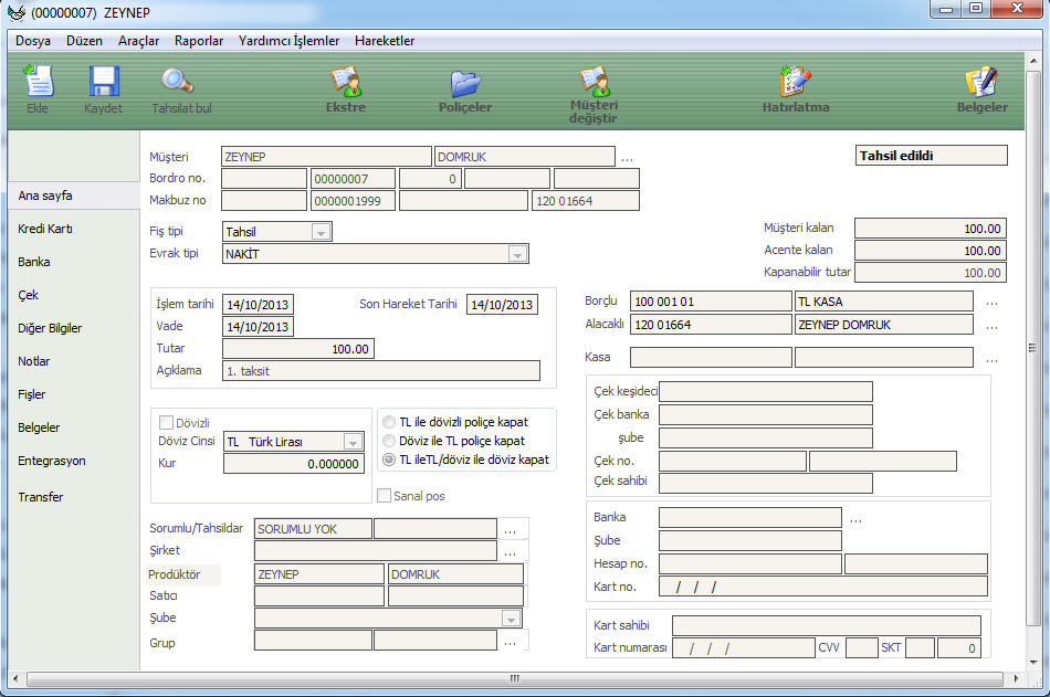 Şekil2: Tahsilat ve poliçe kapama Nakit tahsilat girişi