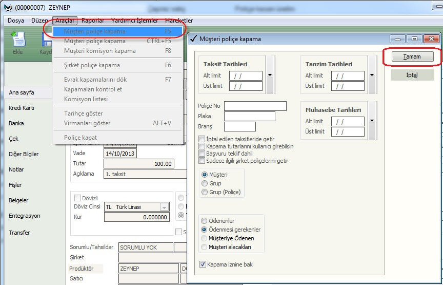 Sonra Tahsilat üzerinde Araçlar menüsünden Müşteri poliçe kapama (F5) adımına girilir.(Bkz. Şekil 3)