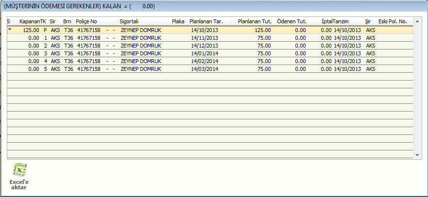 Ayrıca aynı ekrandan (Müşteri poliçe kapama ) Ödenenler seçeneği ile kapatılan taksitler görülür