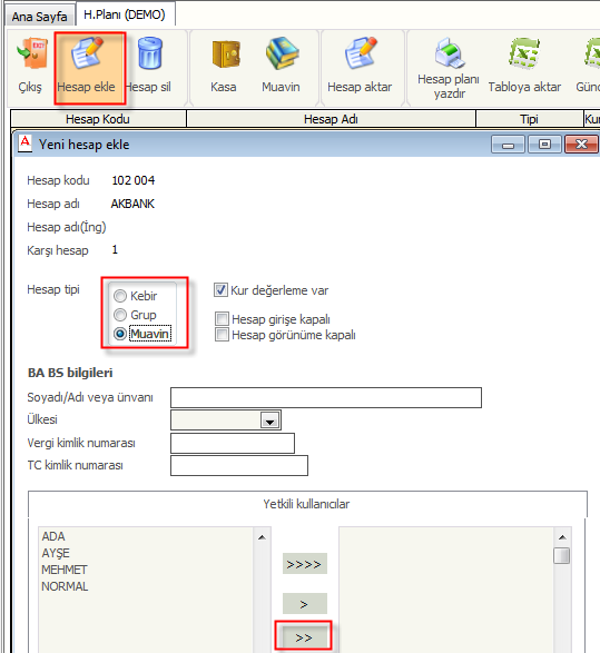 Hesap planınıza yeni hesap eklemek için araç çubuğundan hesap ekle komutu kullanılır. Gelen ekrana hesap kodu ve adı yazılır. Açılan hesabın tipi seçilir. Eğer açılan hesabın her kullanıcı tarafından kullanılması istenmiyorsa sadece yetkili kullanıcılar sağa alınır ve tamam denilir. Bkz.Şekil1