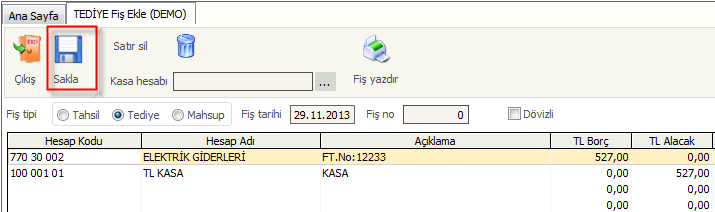Şekil1=Araç çubuğundan fiş ekle komutu