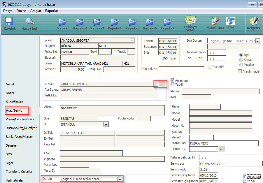 Şekil5=Hasar dosyasına servis ekleme |