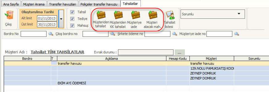 Üst satırda bulunan tahsilatlar kısmına tıklayıp ekrana bütün tahsilatlar getirilebilir. Tahsilat girişi için Müş. Tahsilat’a tıklanır. Gelen ekran Şekil(Düzlemde tahsilat girişi) ‘deki gibidir. İşlemlerde devamındaki gibi yapılır. Ardından oluşan tahsilat evrağı üzerine sağ tıklanıp poliçe kapat ile kapama yapılır ya da poliçe aç ile kapamalar geri alınır. Yine sağ tıklayıp evrakın müşteri kapamalarını dök ve evrakın şirket(acente) kapamalarını dök ile kapama listeleri alınabilir.