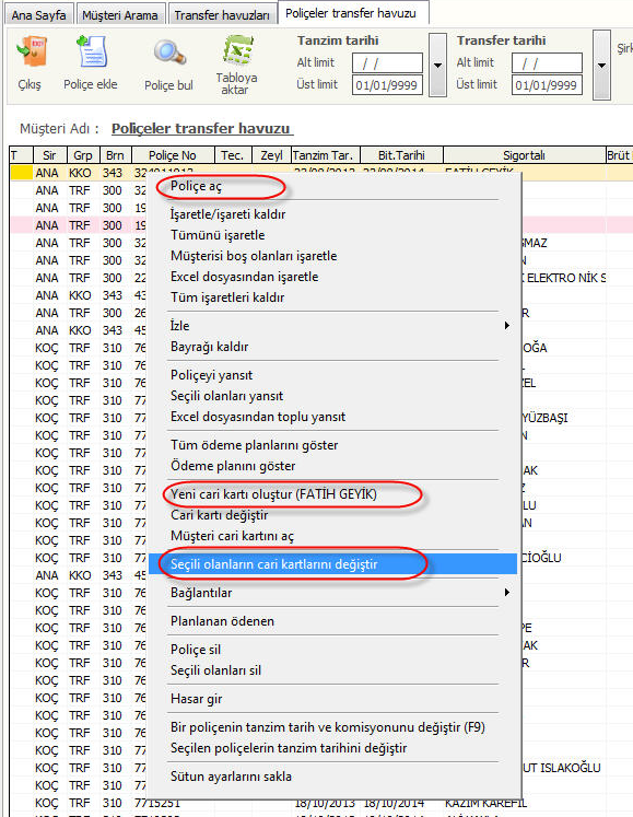 Gelen ekranda müşteri seçimi yapılır. Eğer toplu olarak değişiklik yapılmak isteniyorsa poliçeler ara çubuğu ile işaretlenir. Seçili olanlara sağ tıklayıp seçili olanların cari kartını değiştir’e tıklanır. (Bknz. Şekil 6) |
