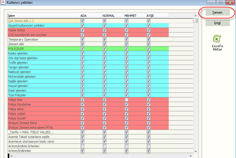 Karşınıza gelen ekranda sol tarafta bulunan işlemler için ilgili kullanıcı altına denk gelen kutucuğun işareti kaldırılır ve tamam'a basılır. Ekranınıza gelen soruya evet denilir ve işlem yapılmış olur.