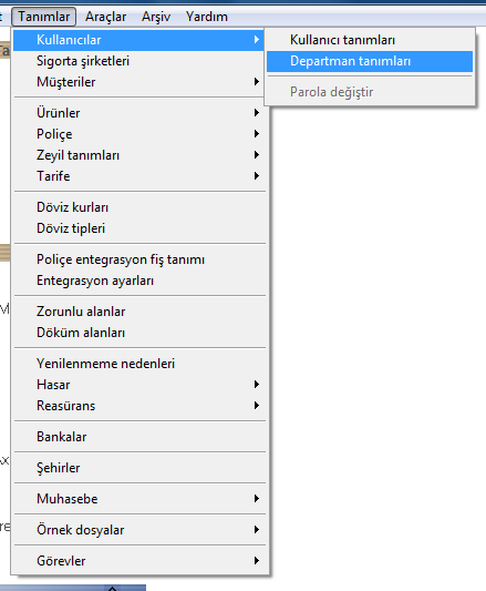 Departman tanımlarını programda yaptığınızda kullanıcı ekleme ekranında Departman bölümünden tanımlarınızı seçebilirsiniz. Departman satırındaki seçiminizden sonra değişikliği Dosya/Kaydet ile saklayabilirsiniz. Departman tanımını Tanımlar/Kullanıcılar/Departman Tanımları kısmından çıkan ekrandan istediğiniz tanımlamaları girip ESC ile çıkış yaptıktan sonra Kullanıcı ekleme ekranından istediğiniz Departman tanımlamasını seçebilirsiniz.