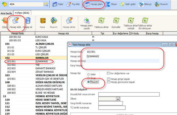 Banka hesaplarınızın eklendiği bölümdür. Bu bölümde k.kartı, çek , senet, havale hesapları tanımlanır. Buradaki hesaplarınızın muhasebe üzerinde de oluşturulması gerekir. Öncelikle Muhasebe bölümünden Hesap planı kısmına gelip, Hesap ekle denir. İlgili muavin hesap yazılır ve kaydedilir. (Bkz. Şekil 14)