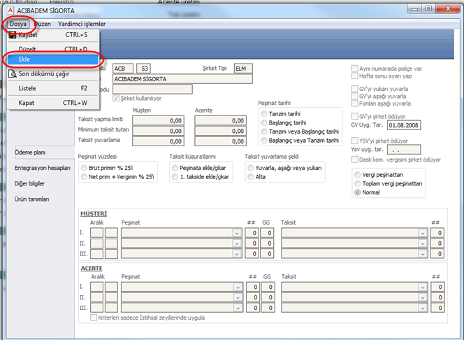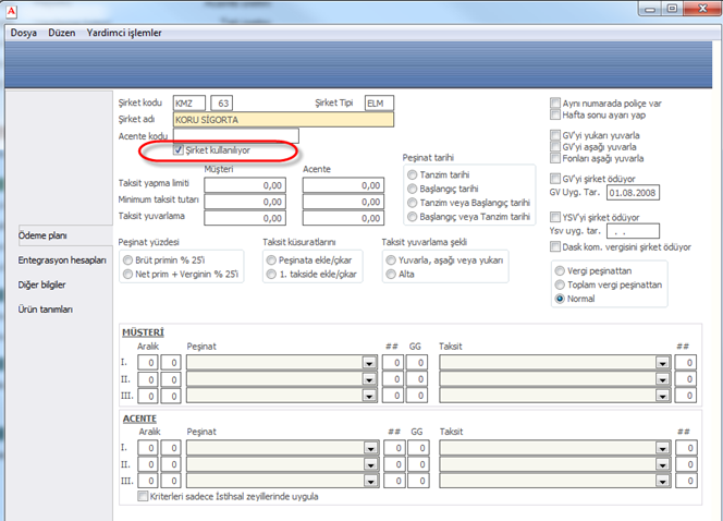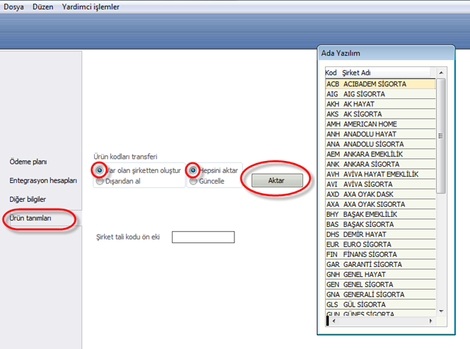 Programdaki mevcut şirketler dışında başka bir şirket tanımlamak istediğinizde veya var olan şirketlerdeki ödeme planı kriterlerini,vergi durumu ile ilgili krıterleri değiştirme işlemi yapılan ekrandır. Ada programında Tanımlar/Sigorta şirketleri adımlarından ekrana ulaşabilirsiniz. Sigorta şirketi tanımlama ekranında Dosya/ekle dedikten sonra Şirket koduna 3 karakterli bir kod ve şirket adı girilip Şirket kullanılıyor krıteri seçilir. Var olan şirketlerde Şirket Kullanıyor seçimi kaldırıldığında raporlamalarda karşınıza çıkmayacaktır. Şirkete toplu olarak başka bir şirketten ürün bilgileri aktarmak isterseniz şirket tanımlama ekranında Ürün tanımları sekmesine gelinir. Var olan şirketten ve hepsini aktar işaretlenip Aktar butonuna basılır. Aktar butonundan sonra ekranınıza çıkan şirketlerden birini seçmeniz yeterlidir. |