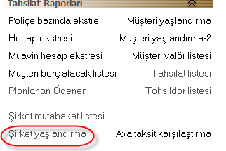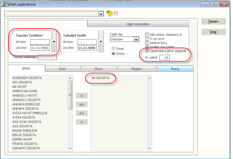 Şirket yaşlandırmada istenilen şirket seçilip sağ kısma atılır ve daha sonra tanzim tarihi verilip listenilmesi istenilen ay adedi değiştirip raporu alabilirsiniz.Ay adedei değiştrilmezse standart olaral 24 ay olarak raporunuzda listelenir.(Bkz.Şekil 14)