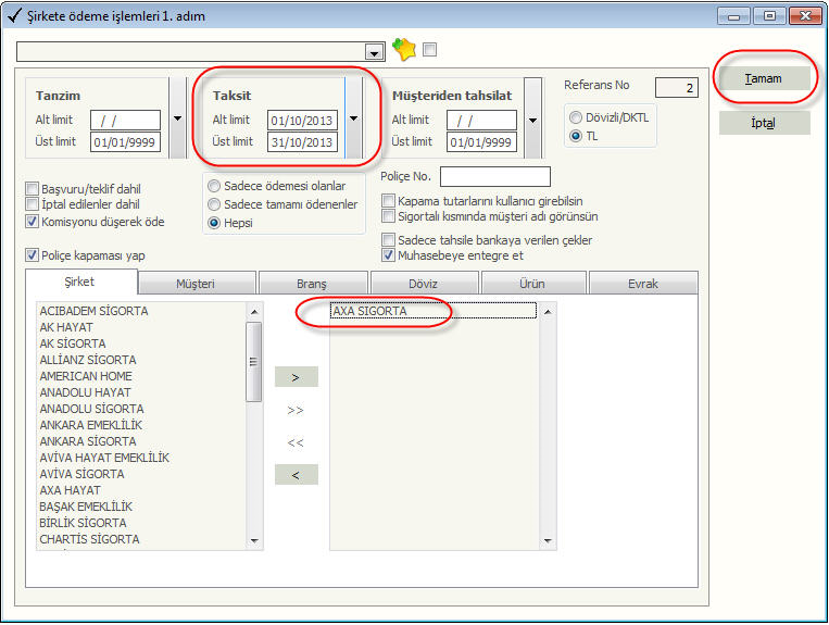 Şirkete ödemeler genellikle şirkete ödeme ekranından yapılır. Bu ekran ile işlemler toplu yapıldığı için daha kolaydır. Yapılan tüm kapama işlemleri tek tek veya toplu olarak geri alınır. Kapama ekranında istenen tarih aralığı, şirket, müşteri, branş ve döviz cinsi seçilir. (Bkz. Şekil 18)