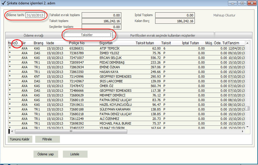 2.adımda yapılan seçimlere göre acentenin şirkete ödemesi gereken taksitler ekrana gelir. ( Bkz. Şekil 19) Şirkete ödeme 2. adımdaki ekranda istenen taksitler ara çubuğu ile işaretlenerek ödemeye dahil edilir veya ödemeden çıkarılır. ‘Ö’ işaretli taksitler müşterinin ödemesini yaptığı taksitleri gösterir. Bu ayrım sayesinde acente müşteriden yaptığı tahsilat ve şirkete yapması gereken ödemeyi karşılaştırır.