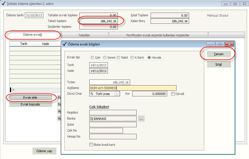 Ödeme evrağı kısmında evrak ekle ile portföyde bulunan kredi kartı, çek veya senetler ile şirkete kapama yapılabilir.