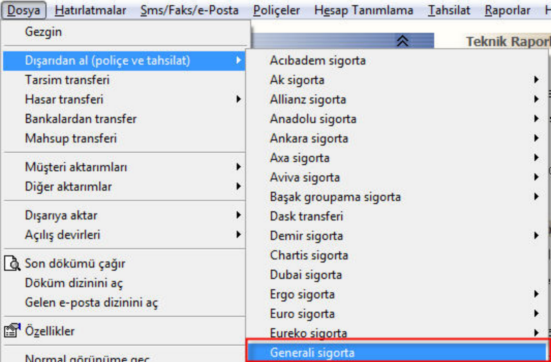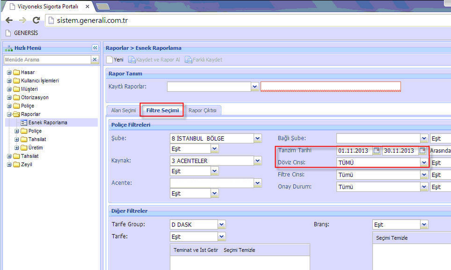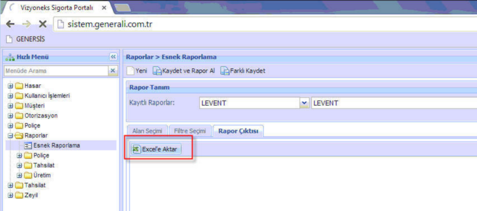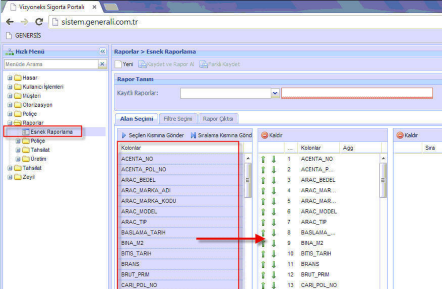 GENERALİ SİGORTA POLİÇE TRANSFERİ Vizyoneks Sigorta Portalı ekranından Excel dosyası alınarak poliçe transferi yapılmaktadır. Raporlar-Esnek raporlama ekranına gelinir. Transfer dosyasında bulunmasını istediğiniz sütunlar sağa alınır.