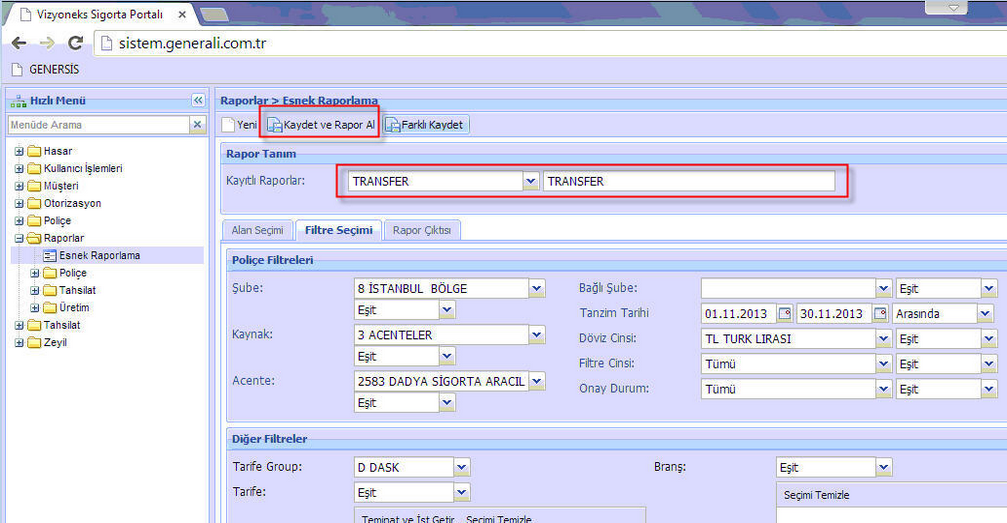 Kayıtlı rapor adınız üzerinden Kaydet ve Rapor Al butonunu kullanıyorsunuz