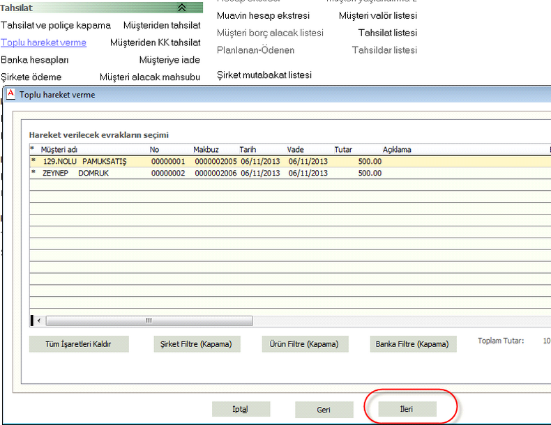 Yukarıdaki bu işlemleri toplu olarak tüm çek, kredi kartı, senet evraklarında yapmanız için; Toplu hareket verme ekranına girilir. Evrak Vade tarihi girilir. İsteğe göre İlgili şirketler ve sonraki ekrandan ilgili müşteriler seçilebilir. Hareket verilecek evrak tipi sağ kısma atılır. Evrak durumu ve Uygulanacak hareket seçilip ileri denildikten sonra ekrana hareket verilecek evraklar gelir. İleri dedikten sonra toplu olarak bu evraklara hareket verilmiş olur. (Bkz. Şekil 17)