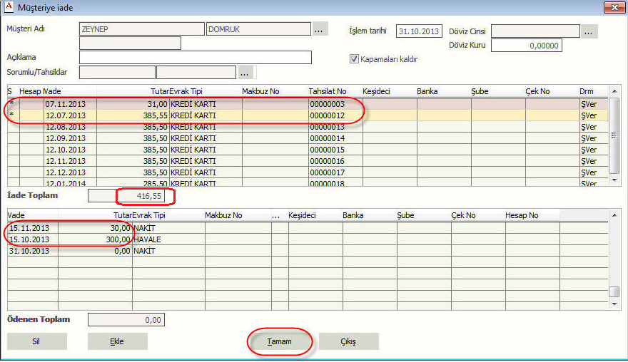 Alt tabloda ise iade olacak evrakların yerine alınan evrak girilir. Toplam tutar yazılıp evrak tipi seçilir. Kredi kartı, çek, senet ise vade tarihi girilip tamam’a basılır.