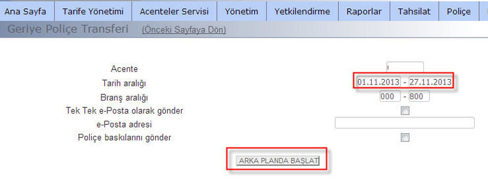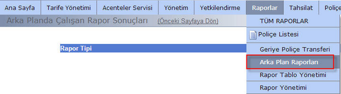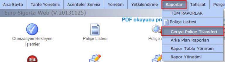 Raporlar-Geriye Poliçe Transferi adımına gelinir
