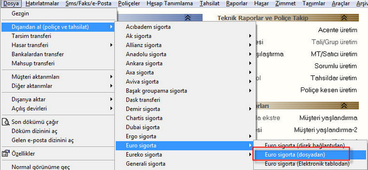 Ada Yazılıma aktarmak için Dosya – Dışarıdan Al – Euro Sigorta – Euro sigorta dosyadan adımları takip edilir. XML dosyası seçilip transfer gerçekleştirilir.