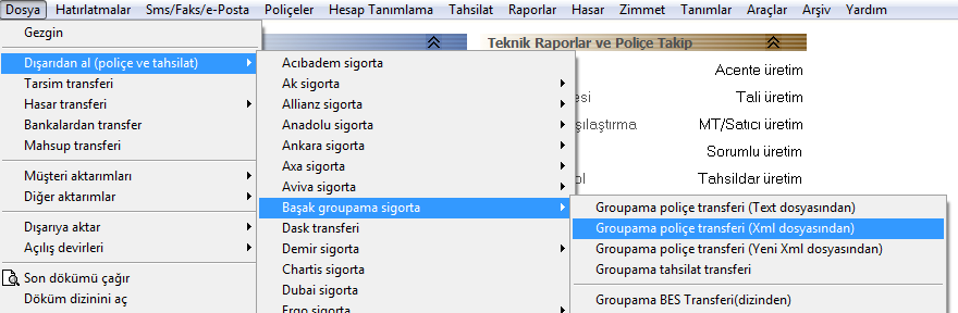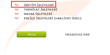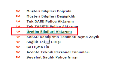 Açılan ekrandan “Üretim İşlemleri / Poliçe İşlemleri / Üretim Bilgileri Aktarımı” menusune gelinir.