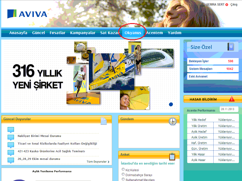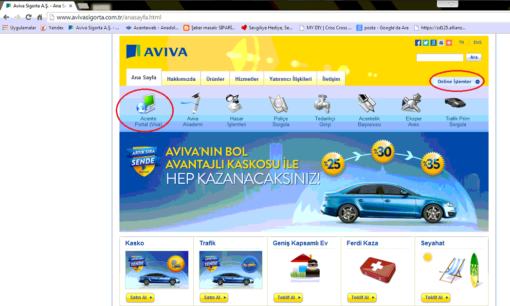 Aviva Sigorta poliçe transferi Öncelikle Avivanın ekranından “Online İşlemler” menusune girilir. Ordan “Viva” ekranına tıklanır. Gelen ekrandan kullanıcı adı ve şifre girilir.