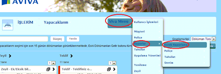 “Okyanus” menüsüne tıklanır. Ordan “Viva Menü / Raporlar / Esnek Raporlama” seçilir.
