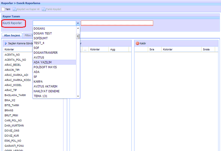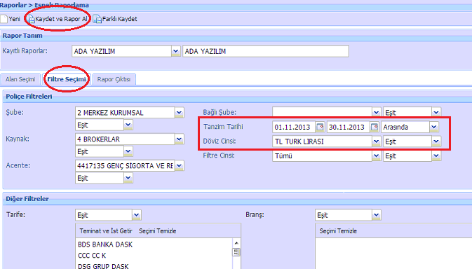 Gelen ekranda kayıtlı raporlar arasından varsa Adayazılım olan seçilir. Filtre seçimi sekmesine gelinir. Bu sekmeden Tarih aralığı ve döviz cinsi belirlenir. Üstte yer alan “Kaydet ve Rapor Al” butonuna tıklanır.