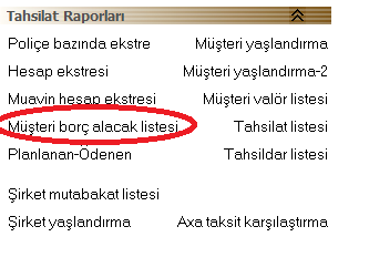 Tahsilat Raporları ekranında Müşteri Borç alacak Listesi giriş ekranı;