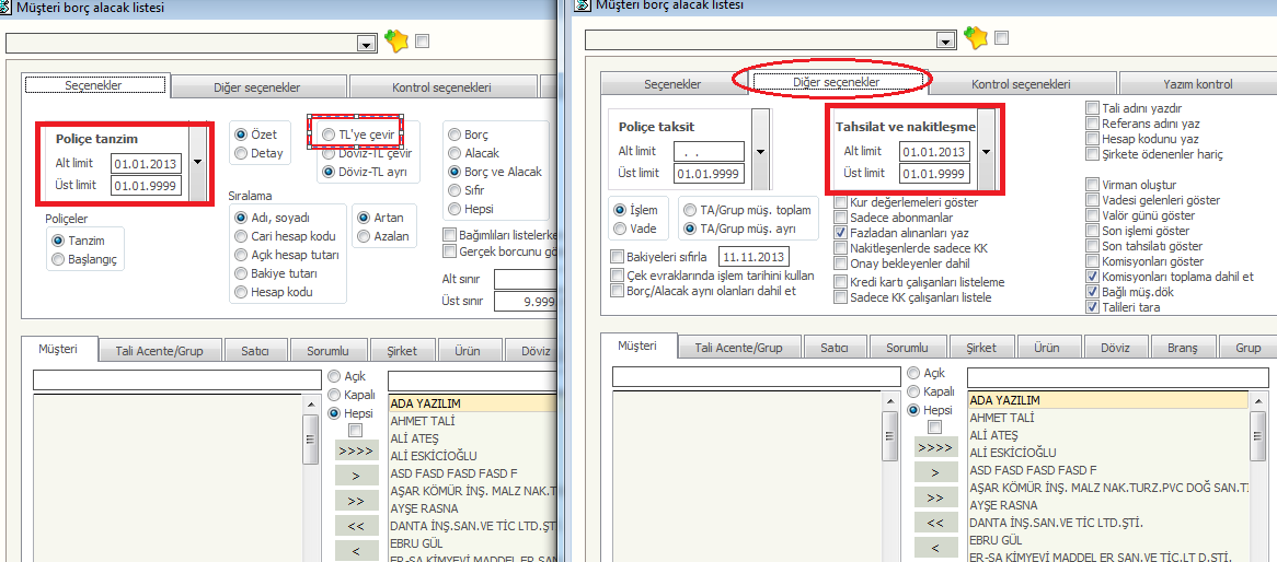 Borç Alacak Listesini alırken Müşteri ekranından istenilen cari veya cariler diğer kısma atılır.Poliçe tanzim tarihi kısmına istenilen tarih girildikten sonra aynı tarih Diğer Seçenekler kısmında Tahsilat ve nakitleşme tarihi kısmına da yazılır. Dövizli çalışan carileri TL olarak görmke için ise TL'ye çevir kriteri işaretlenir.(Bkz Şkl 8)