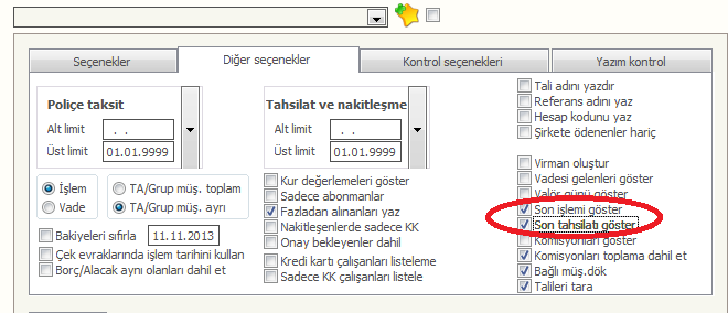 Borç Alacak Listesinde cariler üzerinde yapılan son işlemi ve girilen son tahsilat bilgilerini yazdırabilirsiniz.Bunun için Borç Alacak Listesinde Diğer seçenekler sekmesinde Son işlem göster ve son tahsilatı göster seçimleri işaretlenmelidir.(Bkz Şkl 9)