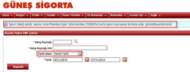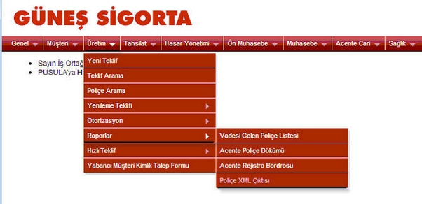 GÜNEŞ SİGORTA POLİÇE TRANSFERİ Güneş sigorta transfer dosyası pusula ekranından yapılır. Üretim - Raporlar - Poliçe XML çıktısına gelinir.