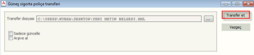 Almış olduğunuz XML dosyasını Ada Yazılıma aktarmak için Dosya-Dışarıdan Al-Güneş Sigorta - Güneş Sigorta XML dosyası(Pusula) demeli ve transfer dosyasını seçmelisiniz
