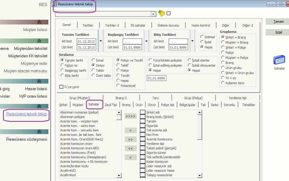 Reasürans poliçeleri ile alakalı rapor alabilmek için, Reasürans teknik takip raporunu kullanabilirsiniz. Raporda bir çok kriter bulunmaktadır. İstenilen kriterler işaretlenip liste alınabilir. Örnegin, sahalar sekmesinden raporda gozukmesini istediginiz alanlar sag tarafa atılabilir. Tanzim tarihine tarih verilip belli bir tarih aralıgına ait poliçelerin raporu alınabilir.