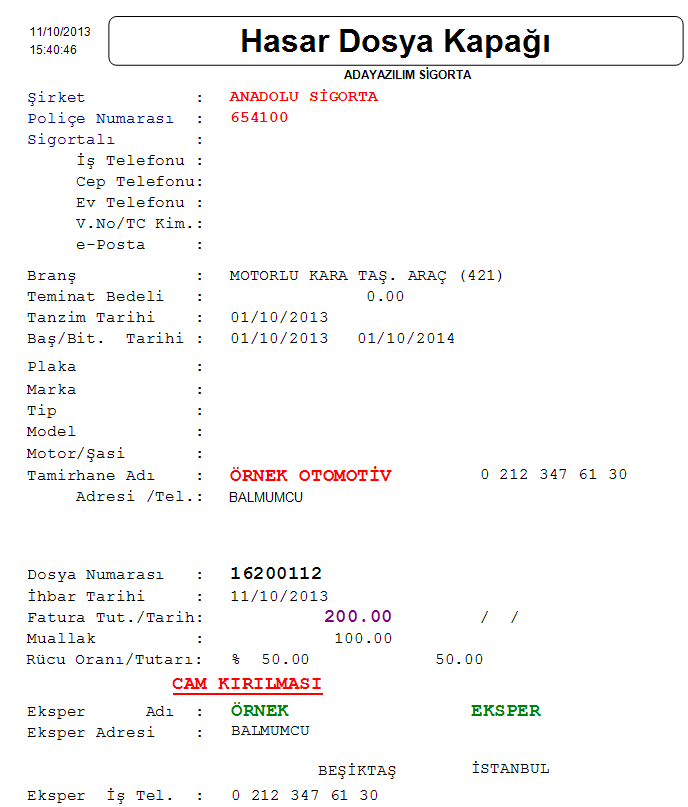 Kapak olarak isimlendirilen buton üzerinden alınan hasar dosya kapağı aşağıdaki gibidir. Bkz.Şekil15