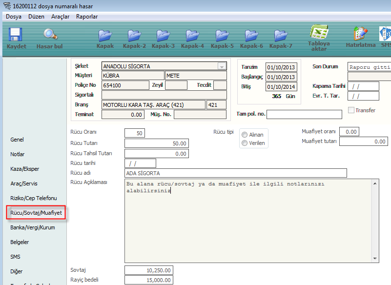 Şekil7=Hasar dosyasının rücu ve sovtoaj bilgileri |