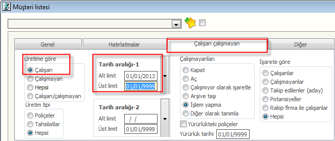Üretime göre müşteri listesi alabilirsiniz. Çalışan çalışmayan sekmesi altından Üretime göre başlığını kullanarak Çalışan'ı işaretleyip Tarih aralığı-1 için aralık verirseniz verilen tarih aralığında poliçesi olan müşteriler listelenir. Bkz.Şekil32