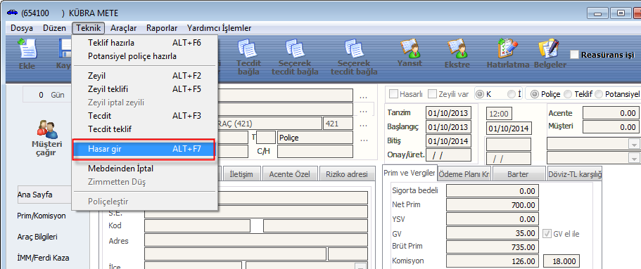 Tüm poliçeler ekranından hasar gişi yapılacak olan poliçe bulunur. Teknik menüsü altından Hasar gir seçeneği kullanılarak hasar ekranı çağırılır. Bkz.Şekil1