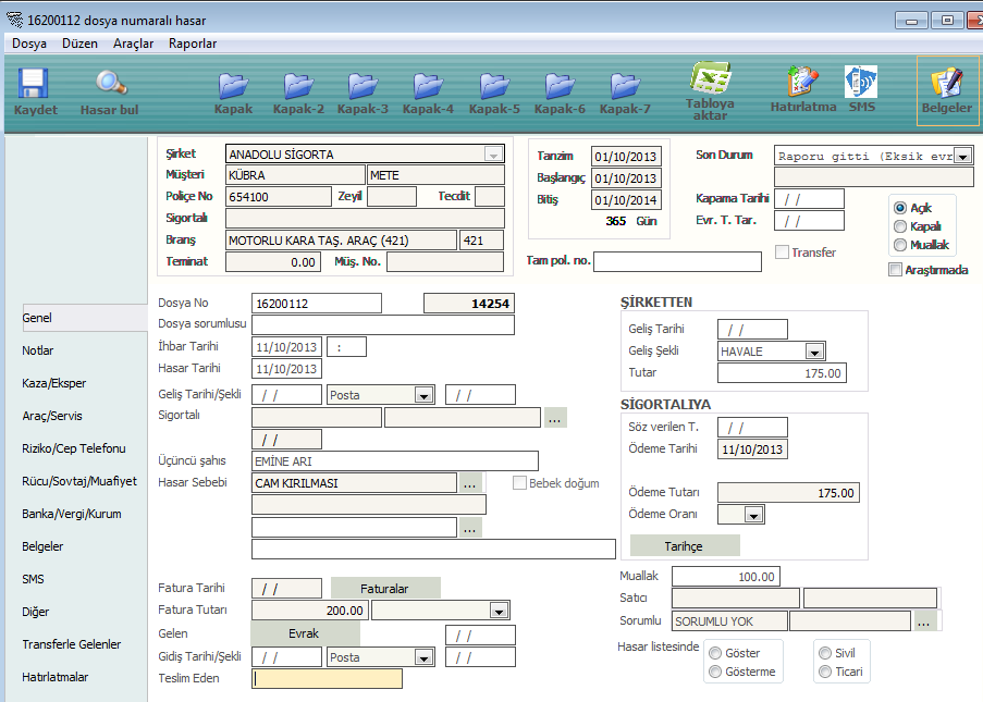 Ekleyeceğiniz hasar ile ilgili dosya numarası, muallak tutarı, hasar sebebi, ihbar ve hasar tarihlerini, hasar son durumunu bu ekrandan yazabilirsiniz. Müşteriye yapılan ödeme tarihçe kısmından girilir. Tarihçe ekranından girilen ödemeler ödeme tutarı alanında toplanarak gösterilecektir. Bkz.Şekil2