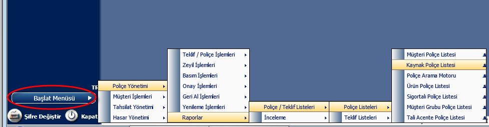 Sfs ekranında; Başlat Meüsüne tıkladıktan sonra Poliçe Yönetimi/Raporlar/Poliçe-Teklif Listeleri/Poliçe Listeleri/ Kaynak poliçe Listeleri şeklinde adımlar takip edilir.
