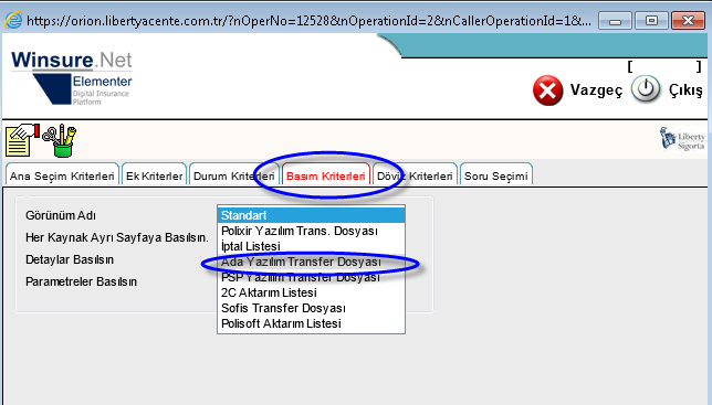 Ek olarak çıkan diğer ekrandan ise Basım Kriterleri sekmesine tıklanıp Görünen Ad kısmından Ada Yazılım Transfer Dosyası olan seçim yapılır.