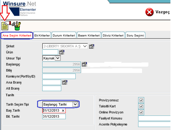 Dosya seçim işleminden sonra Ana Seçim Kriterleri sekmesinden ise Tarih Seçim Tipi kısmından Başlangıç Tarihi seçilir ve istenilen tarih aralığı yazılır.Bu işlemler bittikten sonra Sol üst köşeden Rapor hazırlanılır.(El ikonuna basılır)
