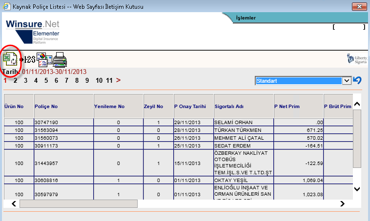 Poliçelerin raporlandığı ekrandan ise Excel dökümüne tıklanıp rapor Excel'e atılır.