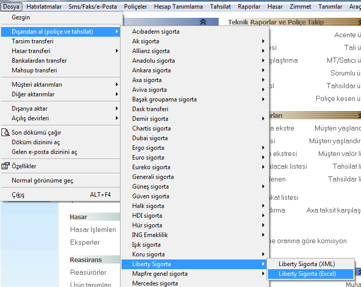 Giriş yapılan ekrandan Liberty şirketinin Winsure sekmesinden SFS ekranına giriş yapılır ve transfer dosyası Excel formatında oluşturulur.